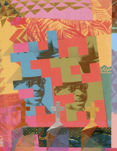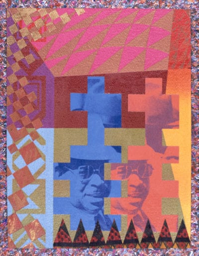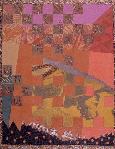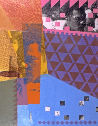 At first glance, Joyner’s works attract the viewer because of their intricate and complex designs. But after careful examination of his compositions, one discovers the artist’s unique methods of communicating through a variety of media all of which have become very comfortable for him. Collage, hand painting, photography and screen-printing are various techniques he uses to create art. Mixed media compositions of color, patterns, and images are the vehicle by which Joyner creates an African aesthetic in his work. Design elements abstracted from African symbols, sculpture, architecture, ceramics and textiles are the sources from which his ideas evolve.
